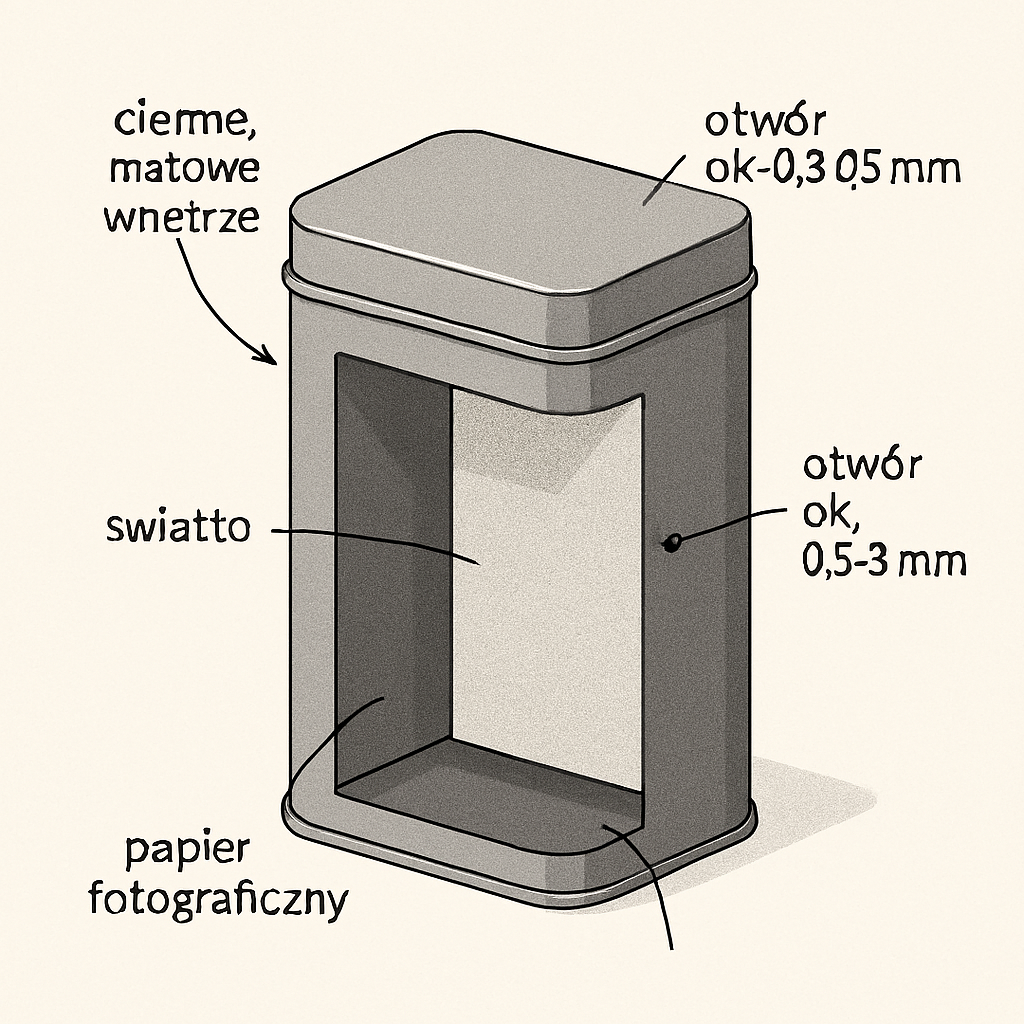 Aparat do solarygrafii to niezwykle prosta, a zarazem fascynująca konstrukcja oparta na zasadzie camera obscura. Wykonuje się go z nieprzezroczystego pojemnika — może to być puszka po kawie, plastikowa tuba, a nawet pudełko po kliszy — którego wnętrze zostaje dokładnie poczernione. Ciemne wnętrze eliminuje odbicia światła, co pozwala uzyskać czystszy i bardziej kontrastowy obraz. Na jednej ze ścianek, zazwyczaj na wysokości około dwóch trzecich wysokości obudowy, wykonuje się niewielki otwór o średnicy od 0,15 do 1 milimetra. To właśnie ten otwór pełni funkcję obiektywu — przez niego światło słoneczne wpada do wnętrza aparatu i tworzy obraz na materiale światłoczułym.